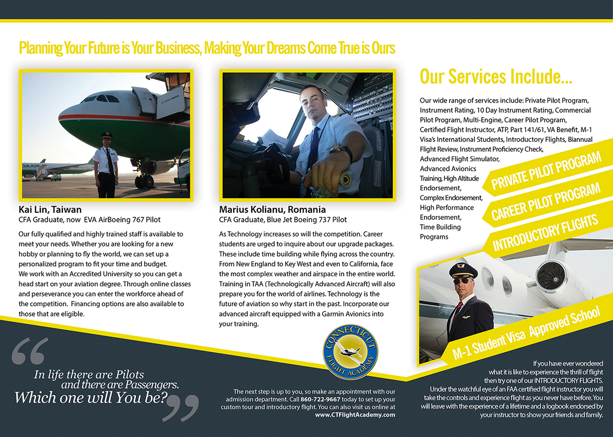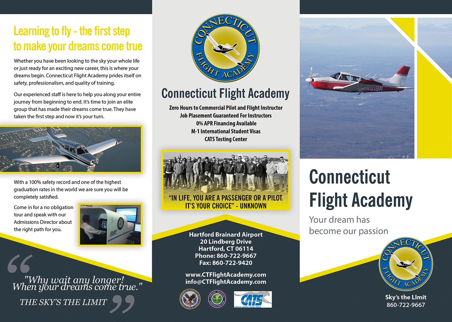 Connecticut Flight Academy is one of the premier flight academies in the Northeastern United States. We currently have a 20 plane fleet, including 2-seat Piper Tomahawks training aircraft, 4-seat Piper Cherokees with advanced avionics, complex aircraft for commercial training, and multi engine aircraft for career bound students. We also have an Elite RC-1 FAA Approved Training Device to enable our students to experience and practice flying in an advanced simulator setting. Please contact our admissions director for a no obligations tour and to discuss the right path for you.
